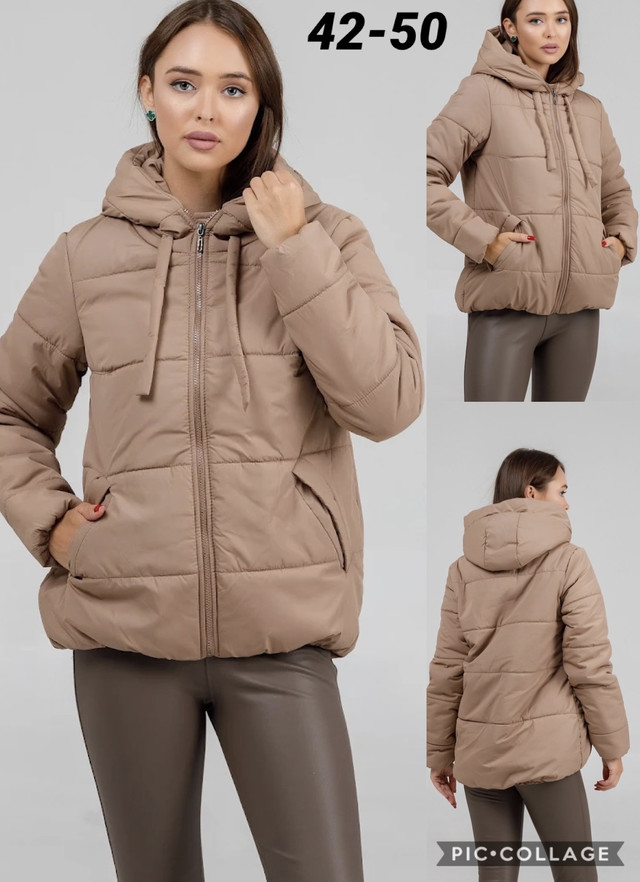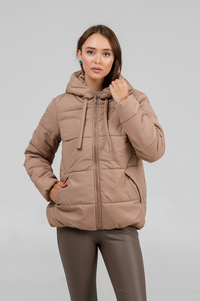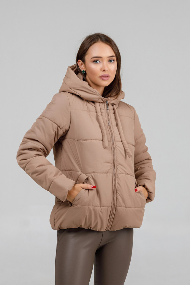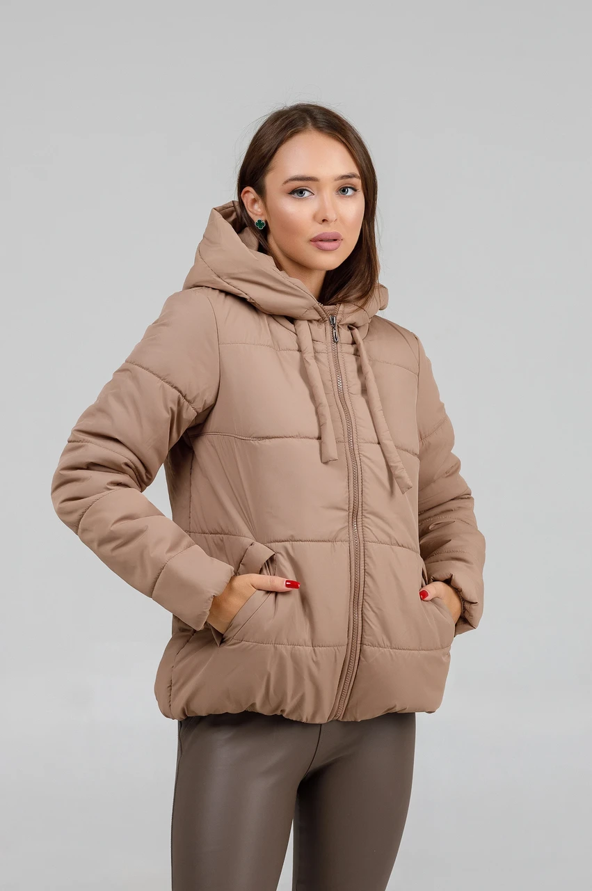 Куртка жіноча осіння коротка бежева з капюшоном. Довжина до середини стегон. Застібається на пластмасову блискавку. Бігунок металевий. З боків куртки дві прорізні косі кишені. Капюшон не відстібається. На капюшоні є тканинний шнурок для регулювання об'єму. Знизу курточки та на рукавах є резинка. Всередині є пришивна кишенька.