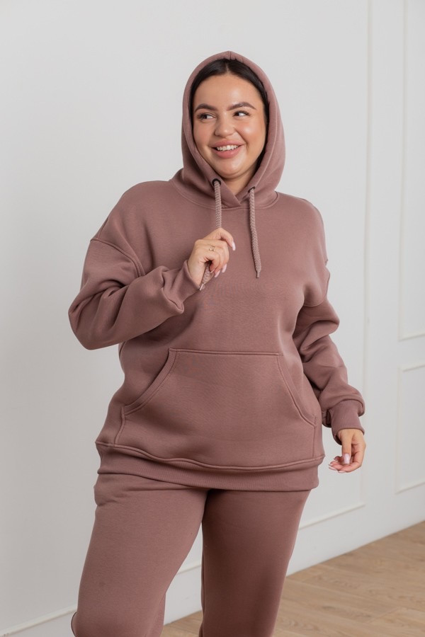 Костюм жіночий зимовий спортивний бежевий худі та штани великого розміру. Стильний і теплий костюм із начосом, добре підійде для зимового періоду. Худі з капюшоном. На капюшоні є шнурок для регулювання об'єму. Спереду суцільна кишеня. Рукави та низ кофти з манжетами. Плечі приспущені.