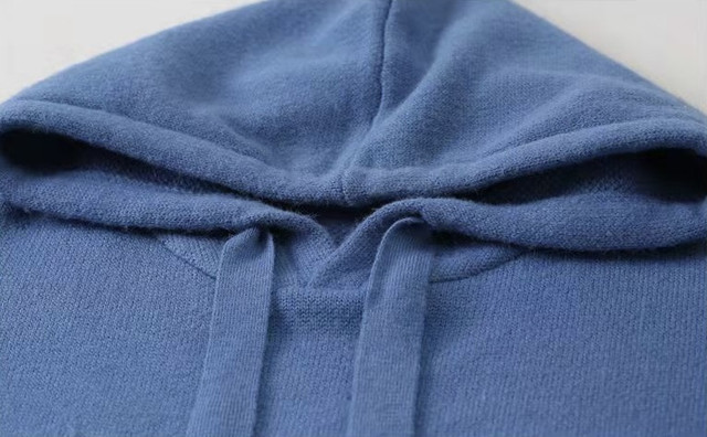 Жіноча синя трикотажна сукня з капюшоном. На капюшоні є шнурок регулювання об'єму. Довжина сукні середня, по коліна або нижче колін, залежить від зросту. Виріб прямого крою, тканина м'яка та еластична. Рукавка з манжетами у вигляді резинки. Низ сукні також на широкій резинці. Плечі приспущені. Виконано у стилі кежуал. Добре поєднується з кросівками, кедами або черевиками.